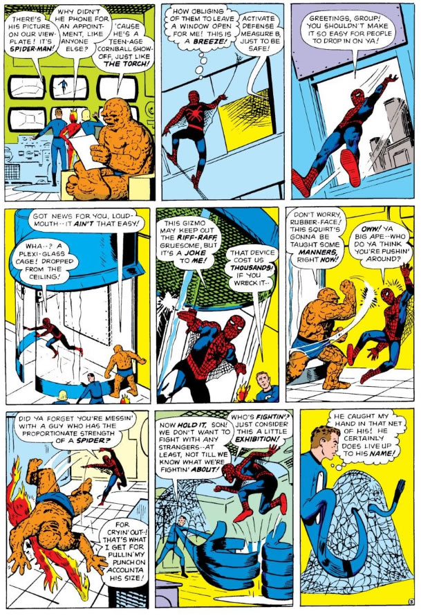 We’ll need the TARDIS to make two stops this post. Both are in 1963. Amazing Spider-Man #1 hit the shelves with a cover date of March 1963 (putting probably in January). As soon as kids grew tired of playing with their Etch-a-Sketch and wood burning kits (hottest Christmas toys of 1962), they tore in the now famous first fight between Spider-Man and Fantastic Four, which in classic Spider-Man Friday Nights Fight tradition, he comes in and beats the crap out of the first family in comics. If you need a refresher, click on these to see the pages: