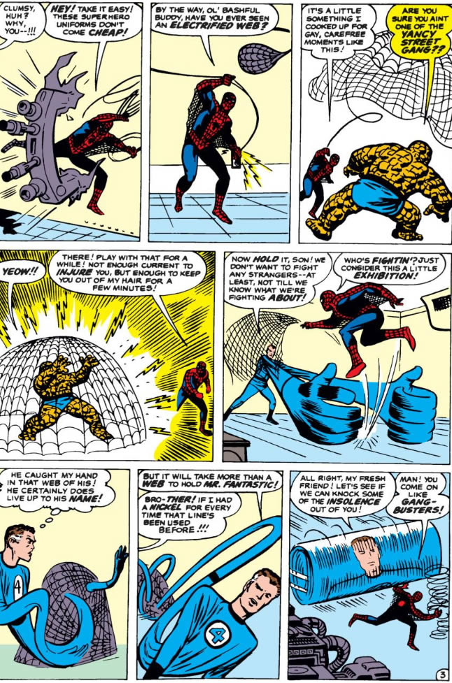 “Have you ever seen an electrified web?” Wait, what? Spidey can plug his webbing into an outlet? Even by 60s science, this makes no sense.
