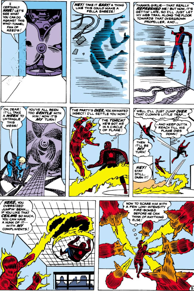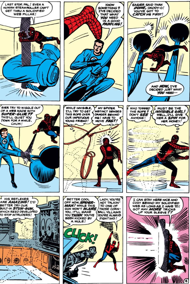 @#13: To be honest I’ve never had a problem with the idea that Spider-Man could use his webbing the way Ditko used it. It makes sense that between controlling the nozzle on the web-shooter and whipping up the formula himself it’d have multiple applications.