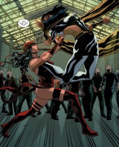 It’s not all jokes and one liners as David has Medea pepper in some political commentary. She goes on her page long monologue and even has a point or two, before Elektra interrupts with a point of a different sort. Agree with any of her views or not, they’re voiced over Raul attacking Jasmine, making them feel more urgent to the story. When we finally cut back to the convention center, Medea’s monologuing pays off when she realizes how she got distracted and lost sight of Elektra, enabling the aforementioned denouement to occur. To paraphrase Sean Connery, I think she got the point.