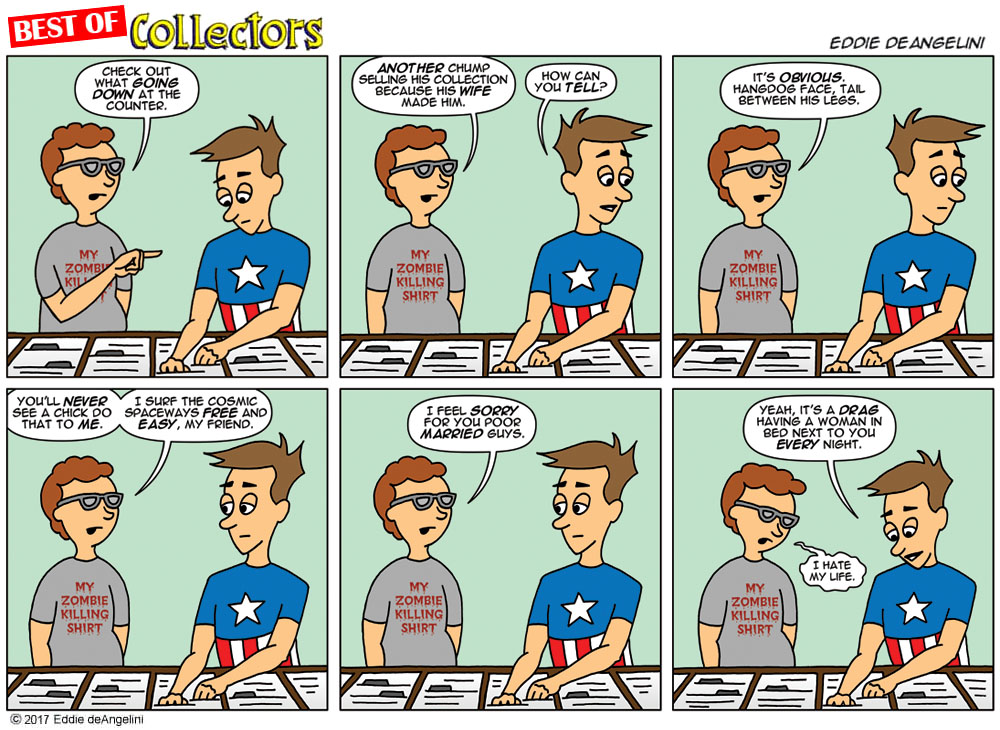Eddie deAngelini is a long time comic book fan and collector. He is the writer and artist of the internet comic strip Collectors, which is loosely based on his own life, marriage and comic collecting obsession. His love of comics began at a young age and his claim to fame is owning every issue of Amazing Spider-Man. He currently lives in Los Angeles with his wife Kristen, where they plan together for the inevitable zombie apocalypse.