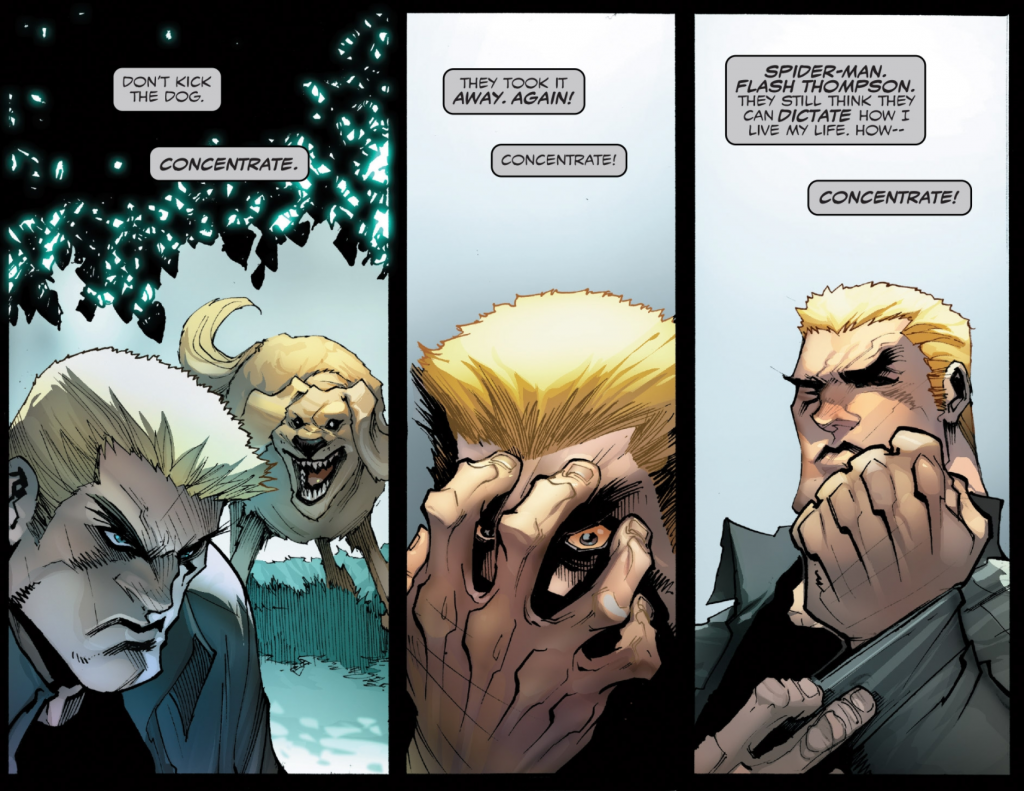 Peter is an obnoxious ass whose only goal right now is to kill Venom. Flash proves to be the only redeeming character in this whole mess. Also, Lee “Sasuke” Price has the Mania symbiote and is using it to somehow to cut other supervillains on the edge. (Including Black Cat and her criminal gang)