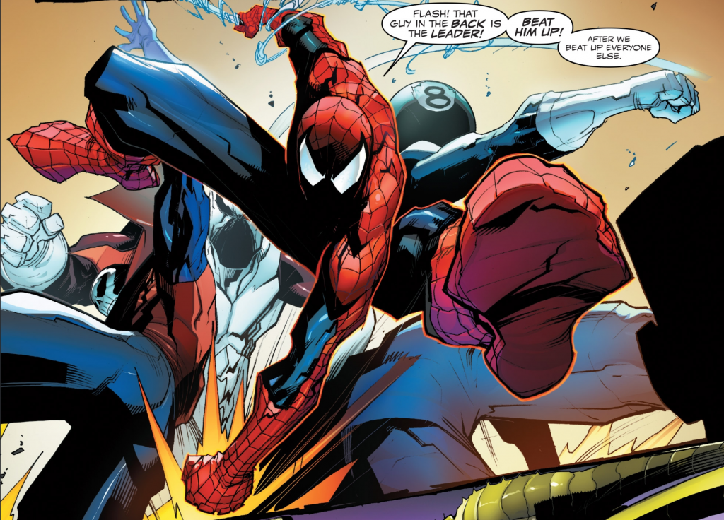 I know Shaun praised Flash last issue for being the MVP, but here he’s absolutely bland and unimportant. All of the characters in this issue (Down to the bit characters like Melter and Scorpion) feel the same and read the same as the next random character. It hurts when each character feels exactly identical and has a lack of identity. What hurts comic dialogue is that characters don’t have actors, per se; they don’t have any voice outside of the words printed on the screen. It’s a problem that Web Warriors and The Transformers shared, and it probably won’t go away before Venom Inc ends.