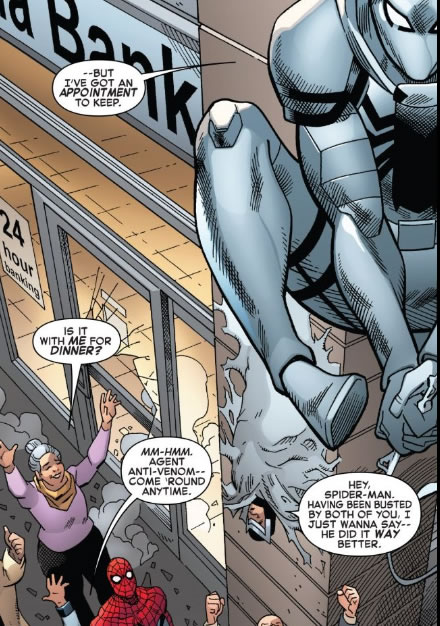 I didn’t mind Anti-Venom being in the issue. My problem was giving him funny lines like Spider-Man. He needs his own personality. Also, regarding Flash, does he have prosthetics now?