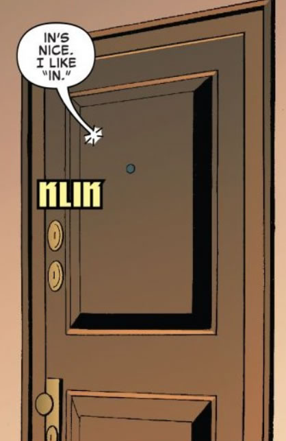 10. @Evan – I was so distressed, I didn’t even get any onomatopoeia joy this issue. We will go with the KLIK of the door. I’ll be nice and jump it up to a 2. 🙂
