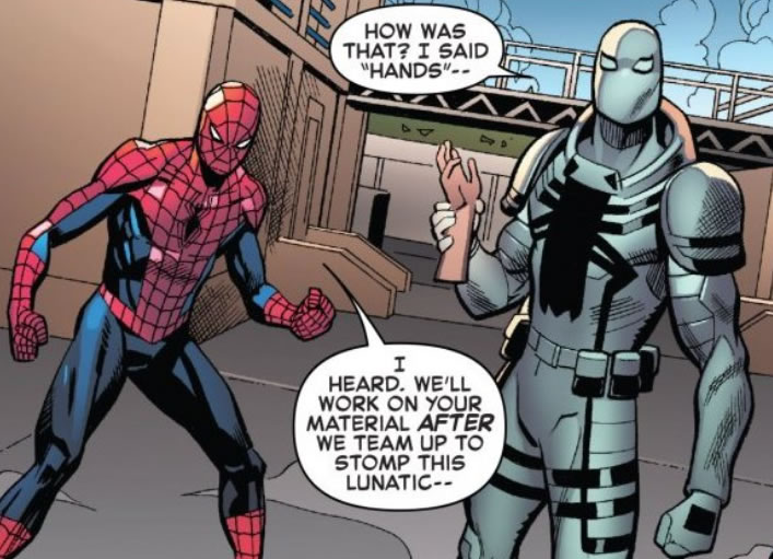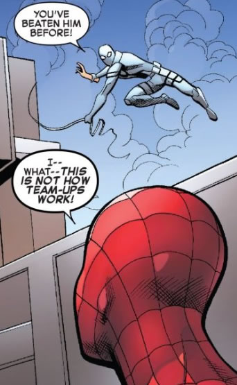 On top of that, after all these years of guest starring in his own book, Spidey doesn’t even understand how team ups work.