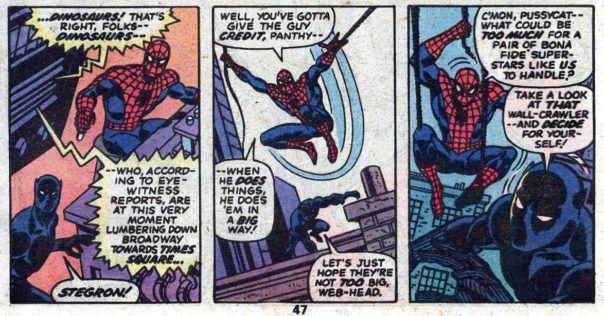 In today’s Panel of the Day we continue slightly from where we left off last week. Spidey DOES NOT actually explain to Black Panther the story so far (probably because it was already recapped earlier in the issue), so I’ll fill in the blanks. Basically, Stegron (The Dinosaur Man) is trying to take over the world with his army of dinosaurs (again) and Black Panther and Spidey, with the help of Curt Connors (aka, The Lizard), are trying to stop him with their science expertise.