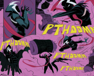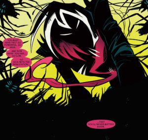 Something I picked up on was Venom’s usage of “we” and “our”, indicating that they are becoming more bonded. However, there was also some struggle in her dialogue where she wasn’t using those terms. Combined with her going all “Hulk smash” on the rooftop and not on Castle, it shows that Gwen is still there and not fully merged yet. We see a little more evidence of this at the end of the book.