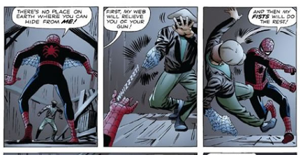We don’t get the onomatopoeia in the first person flashback, but if we did (and they were keeping it in line with Amazing Fantasy #15), what sound should the web shooter have made?