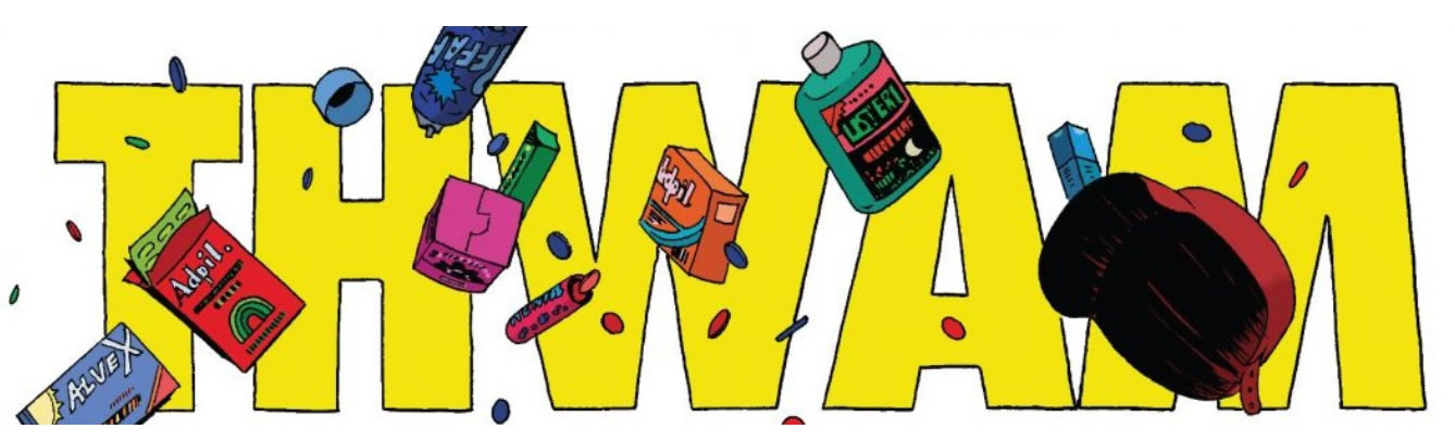 On a scale of 1 (POW) to 10 (BLRKBQRKPQRBLNB), THWAM rates a 4. There were four onomatopoeias to choose from this issue. They were all rather bland. This was the best. Sorry Evan!