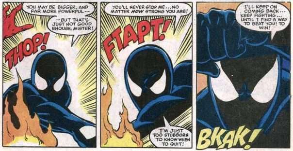 1. It’s the cloth suit made by Felicia. The symbiote suit was removed in ASM #258 by Reed Richards (and thus was born the Bombastic Bag-Man).