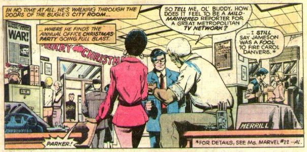 I wondered how Marvel got away with this, but I guess DC don’t have the copyright on bespectacled news anchors in suits! I really like it when both companies have little nods to each other like this, at least when they’re affectionate instead of mean-spirited as they can sometimes be.