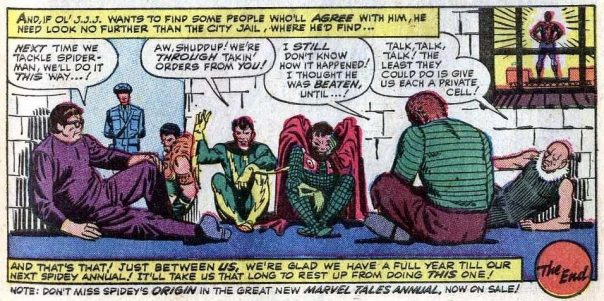 An absolutely lovely ending to a great annual, makes me laugh every time! But uh, putting on my nerdy nitpicking mode, did Sandman forget he could easily slip through those bars? And did Electro forget he could just zap that guard??? Sure Spidey is there, but why not try to overpower him? Which they…. arguably should have done to begin with instead of following Ock’s ridiculous plan???