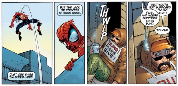 In any other story, Spidey stealing from someone who initially seemed to be a blind homeless guy would be really weird and out of character, but JMS managed to make the situation feel so desperate that I could totally buy him doing it.