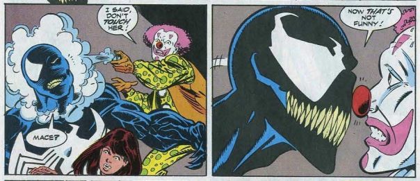 Ah, this must be the sequel to a previous Panel(s) of the Day, one on which I remember commenting that the clown was scarier than venom with his grotesque smile. Look at the expression on Venom’s face in that first panel!