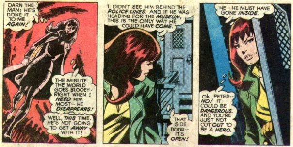 This is why thought bubbles don’t work. Because she’s supposed to already know Peter is secretly Spider-Man, so that inner monologue makes no sense in retrospect.