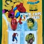 In 1980, Nasta Industries, Inc. produced many office/desk items.  I will most likely do a whole article just about Nasta items in the future.  There are two Nasta products I want to mention for this article. An awesome “School Kit”.  The kit contained a large pencil/lunch money pouch, ruler, eraser, pencil sharpener, and pencil in the same package!  The other item was pencil cap “heads” and square erasers of both Spidey and Hulk in the same package.
