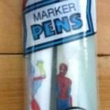 “Bic markers” were becoming popular in the 1970s.  The US Pen Company made some of a similar style with cool Spider-Man artwork on the packaging.  The 1978 package contained three different colors of markers.  In 1980, US Pen Company released Spider-Man and Spider Woman pens in a two pack (marker pens and stick pens).  Keeping up with changes in products, the National Pen Corporation packaged a Spider-Man rollerball marker in 1988, with the classic “running Romita” Spidey image on the cap.