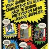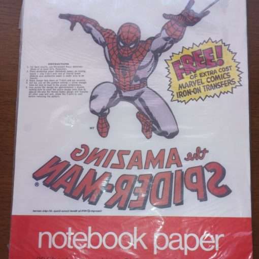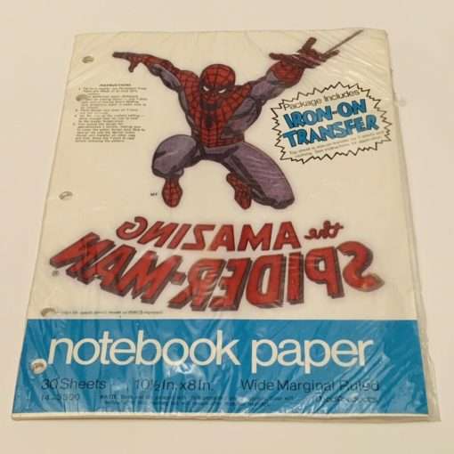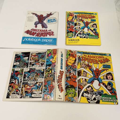 The Spider-Man items featured the cover to Amazing Spider-Man issue 135 (well before The Punisher became super popular).  The Mead product line for each featured character:  2-pocket folder;  large size drawing pad (the cover lifted up vertically, and sheets could be torn out across the top of each sheet); plastic 3-ring binder; wire-bound notebook; pack of 30 sheets of paper (available in college ruled and wide marginal ruled varieties), which also contained a t-shirt iron-on image of the character with the comic book logo beneath the character.