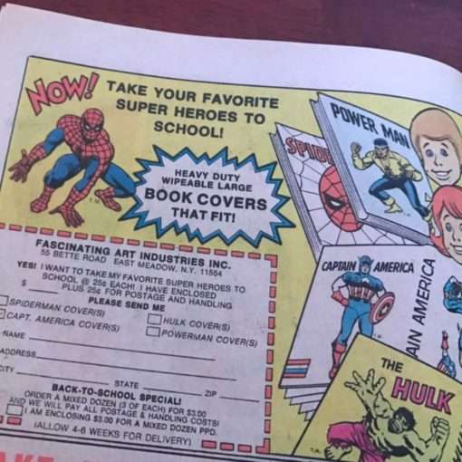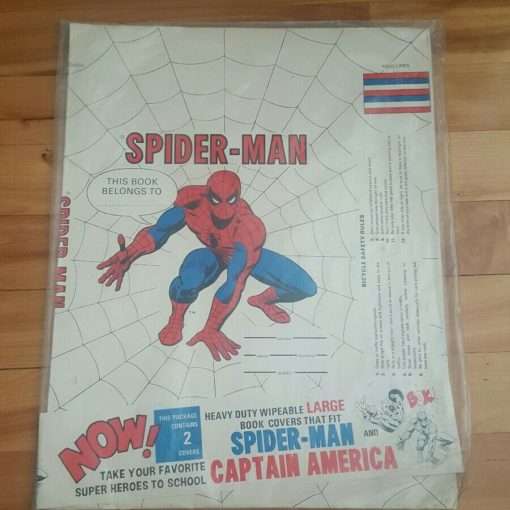 In 1976, other book covers were offered through the pages of comic books.  Two different character’s covers were packaged together.  Thankfully, my two favorites were in the same package!  Spidey and Captain America.  Thankfully, there were bicycle safety rules printed on the book covers as well (apparently the youth of the world needed more bicycle safety back then).  The packaging of the book covers does not mention the manufacturer, but the comic ads mention “Fascinating Art Industries, Inc.”