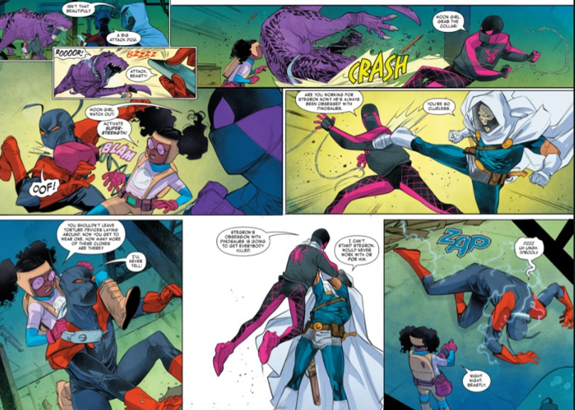 - The art in this installment is top-notch, and it captures the spirit, the vibe, and the vibrant energy that goes hand-in-hand with younger characters like Miles Morales and Moon Girl. This is the same kind of style we have seen in comics like Ghost-Spider, which is also a continuation of the overall aura of the Miles Morales movies. The clash with Taskmaster and Black Ant make for a wild, roller-coaster ride of a battle, and the revelation that they tried to clone the Devil Dinosaur makes the stakes even higher for Moon Girl, on a personal level.