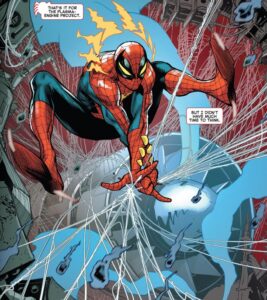 Spidey breaks in, thanks to the Plasma-Engine Project Norman was working on (wow, it’s a good thing this device was mentioned earlier!).