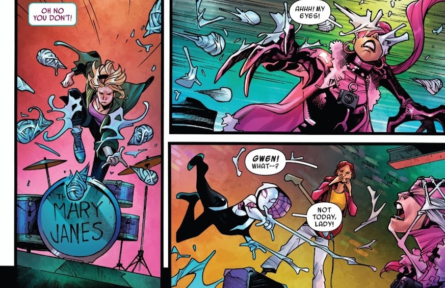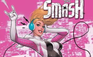 GWEN SMASH! Happy holidays, everybody! I am not quite sure if this will be my last review for the year, but just in case, I’d like to wish everybody a very Merry Christmas and a Happy New Year in advance. As always, it has been a great honor and pleasure to read and write about all my favorite Spidey books. And this week, it is a privilege to give some of my thoughts on the new Spider-Gwen title. It’s promising already to be a fun, light, and colorful adventure for Gwen ahead. We all know that Gwen has had to deal with very serious events in recent memory. But now, we get to sit back, relax and enjoy her doing her “rock star” thing, while also still living out her superhero dream… or responsibility, should I say?