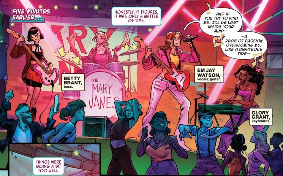 TIME TO FACE THE MUSIC! The Mary Janes are off on a four-city tour as the opening act to one of Earth-65’s biggest rock bands! Gwen has promised the band that this big break will be all about the music. No web-slinging, just drums. But when a mysterious assassin targets the headliner, Gwen begins to wonder how she got this gig in the first place. Featuring new versions of some of your favorite characters!