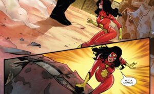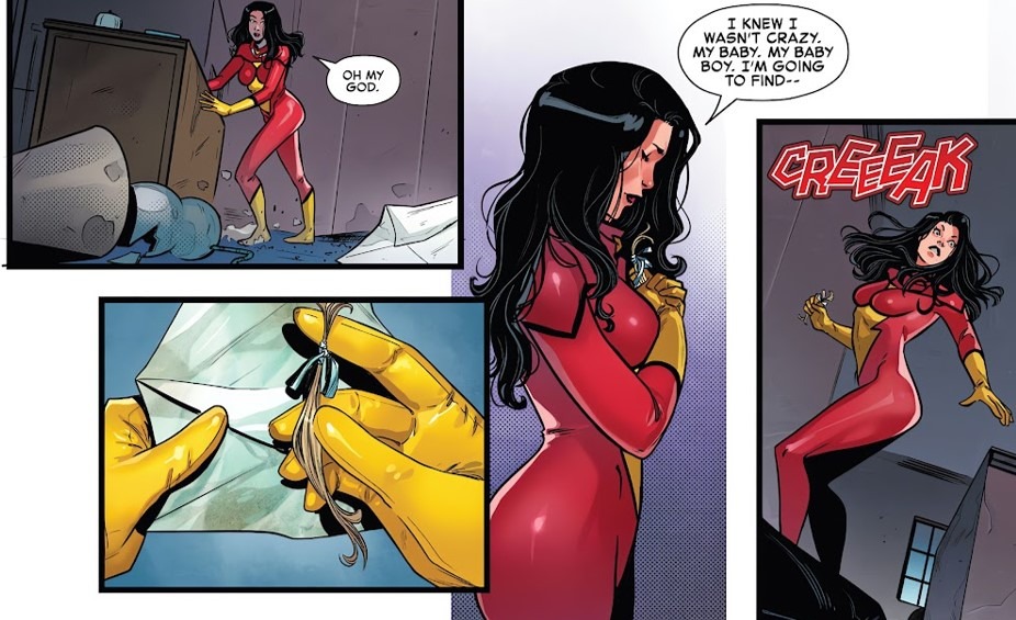 – – Maybe the first issue was not as friendly for newer readers, who will probably be wondering what happened with the Web of Destiny and why Spider-Woman is panicking over her son that doesn’t seem to be around anymore.