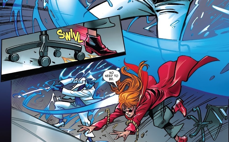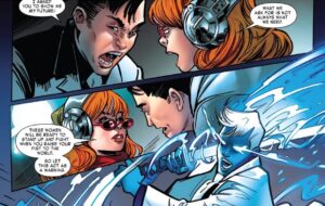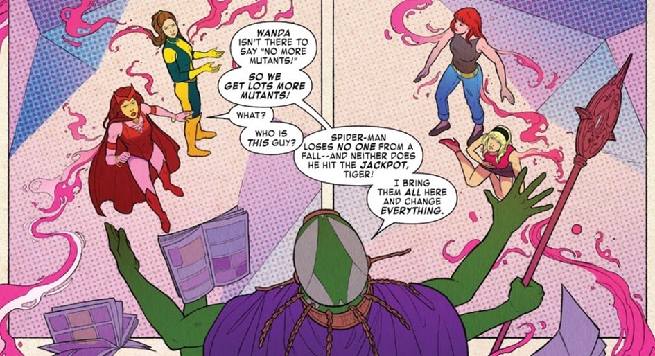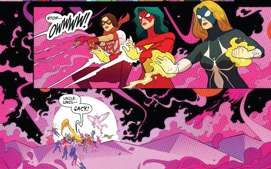 - The first story of the collection, which acts as the main feature, is also a light but fun one. This delusional villain called the Mighty Mitigator randomly takes women away from their realities, creating a bit of a running joke, as all the ladies tell him he is pretty much running a “WHAT IF?” scenario in real-time. He doesn’t like the reference, obviously, but in his head, his plan seems ideal. It’s a crazy story, but it does end with a nice, heartwarming message. The ladies of Marvel end up explaining that, in reality, we all need each other. And just on that note, I will go on record and say I would NOT know what to do with my life if I didn’t have all the lovely ladies in my existence. A lot of women from the Spider-Man universe get good exposure and action in this story, with the likes of Aunt May, Spider-Gwen, Spider-Woman, and others making their presence felt.