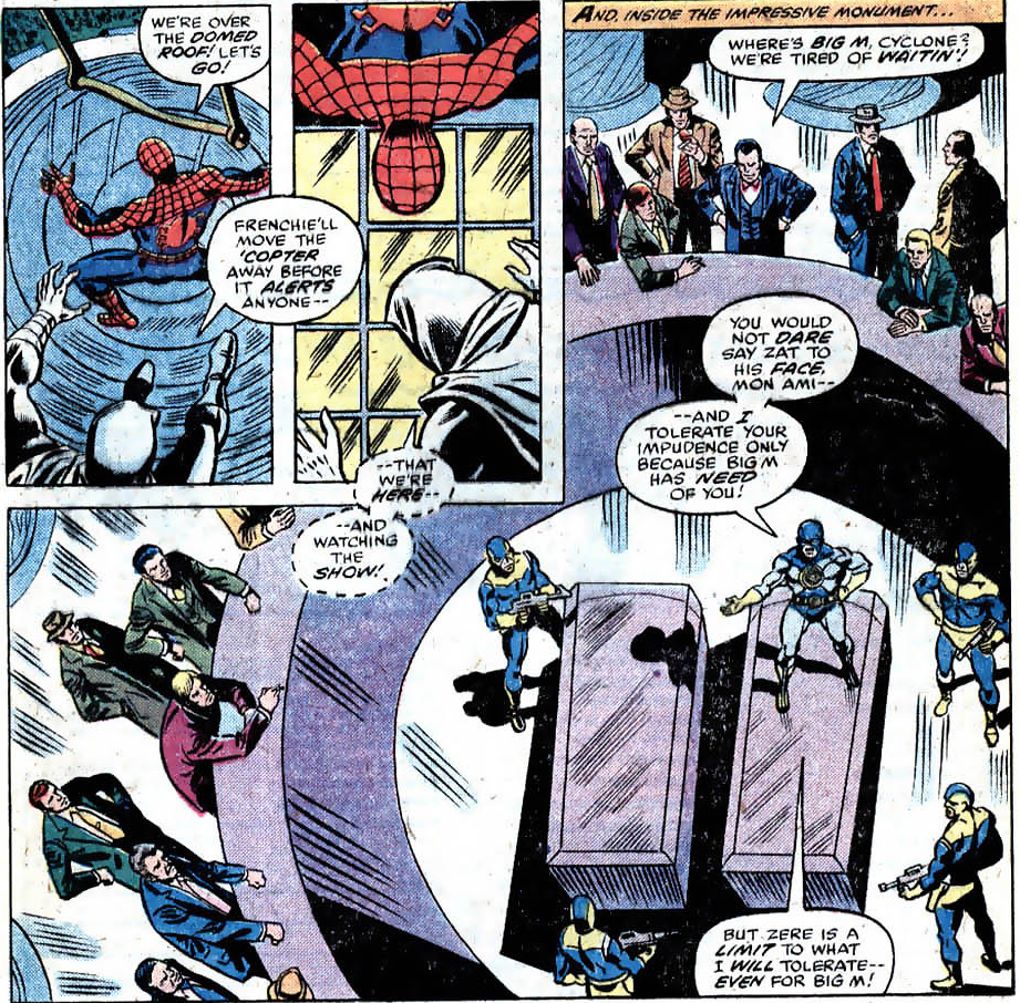 I chose this battle from “Peter Parker, the Spectacular Spider-Man” #23 because it’s not a landmark one immediately thinks of when one thinks of NYC, but that doesn’t make it any less famous! Here, Spidey teams up with Moon Knight to confront Cyclone in a final battle, which I also covered in my look back at the spinning villain (*Another plug for a past Spider-Tracer article? What’s wrong with me?). Cyclone was here to rendezvous with the villainous Masked Marauder, but Spidey and Moon Knight show up before that can happen, leaving the Masked Marauder for another day. Jim Mooney provided the artwork here with a Bill Mantlo-written story.