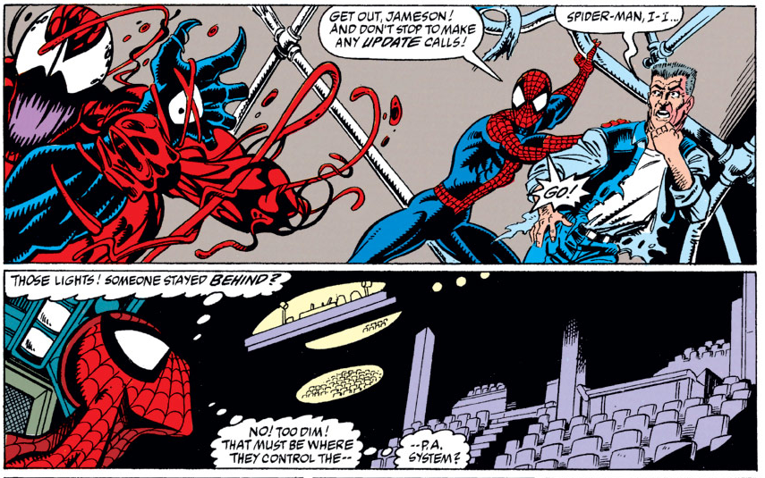 Venom, Carnage, and Rock n Roll was exactly what paying Madison Square Garden customers got in “The Amazing Spider-Man” #363. Wanting to make a statement and show everyone that his chaotic way of life was the way to go, Carnage kidnapped J. Jonah Jameson and planned to kill him in front of the crowd before Venom and Spider-Man showed up to stop him. Spider-Man also decided to stop Venom as well (by attaching both him and Carnage with the PA system), who had come out of his self-imposed island-based retirement to help Spider-Man. “No respect!”, eh, Venom? Mark Bagley drew this David Michelinie-written story.