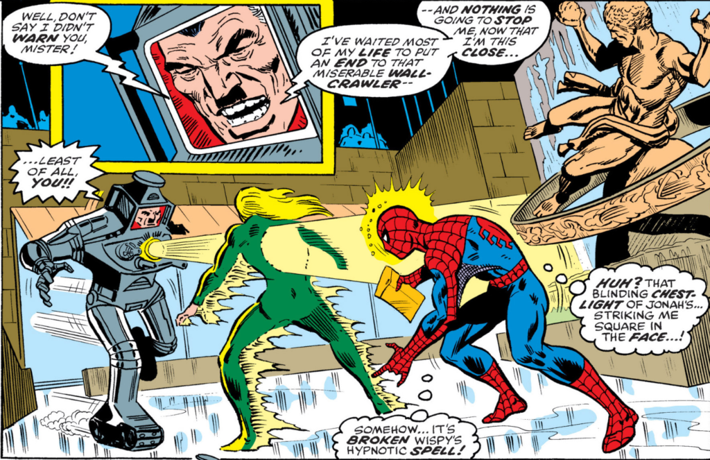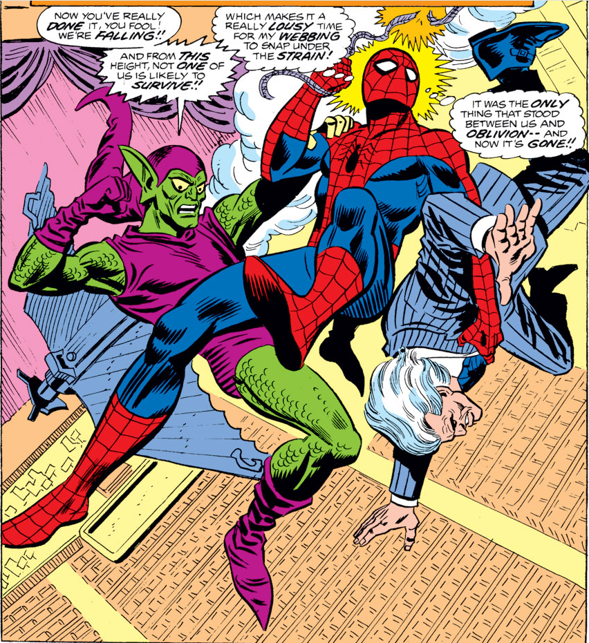 Ross Andru stuns again with this story in “The Amazing Spider-Man” #179-180 (it’s a longer story than that, but those issues feature our designated location). A three-way battle between Spider-Man, Silvermane, and the third Green Goblin, Bart Hamilton, surely stunned the onlookers. Well, it would have, if they weren’t running for their lives.