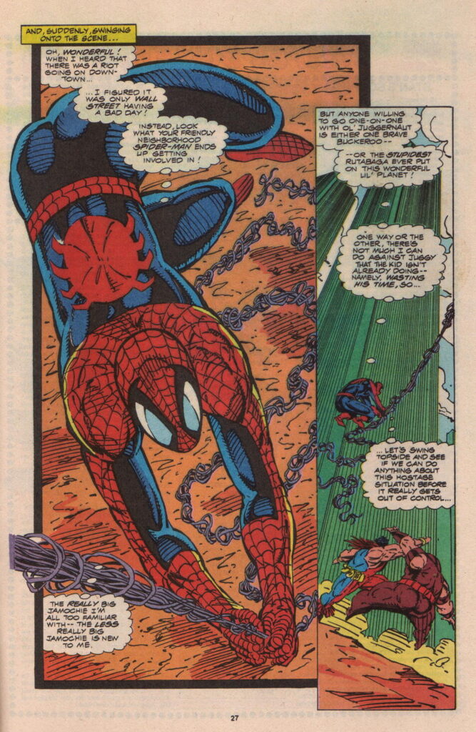 Years before tragedy struck this NYC landmark twice, Spidey teamed up with X-Force to take on the Juggernaut and Black Tom Cassidy in a 1990s crossover, which occurred in “X-Force” Volume 1, #3 and the adjectiveless “Spider-Man” #16. This storyline would also be writer/artist Todd McFarlane’s last with ol’ Web-Head (while Rob Liefeld handled the X-Force portion of the art). One of the reasons it’s said that Todd left Marvel to go help found Image Comics was due to censorship that occurred in this story between Juggernaut’s eye and one of Shatterstar’s swords. Ouch!