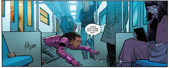 The doors were closing, a woman got yanked out, attacked by a mob boss, then a fight between said mob boss happens and their local neighborhood Spider-Man and yet not a single one of them bat an eye or even care as Janice falls to the floor gasping for her life. Tsk, tsk! If this happened in the South, there would be several people running in to interfere with the fight! It’s like poor Kitty Genovese all over again. (As a side note, Chi-Town texted me and said these passengers reflect his attitude toward this whole run.)