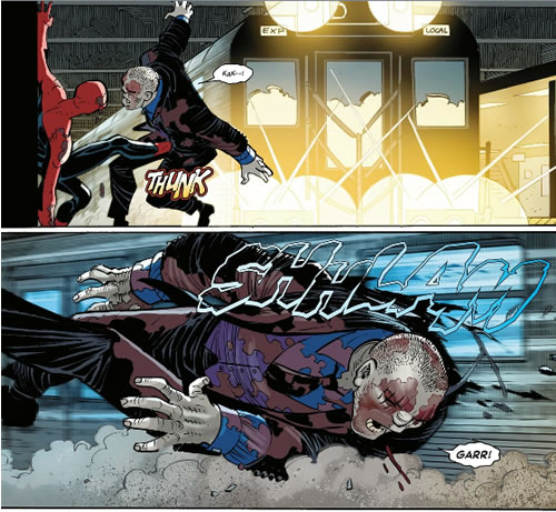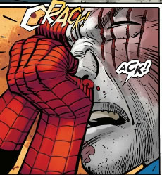 Spider-Man – What does the violence in this issue say about Spider-Man? Nothing that we don’t already know about our hero. He doesn’t give up and he always does what is right – even if it means his death. Despite the brutality of his actions (he kicked Tombstone into the side of a moving train and flat out broke his thumbs), he always saves the day.