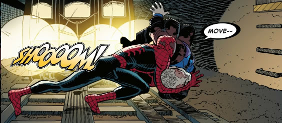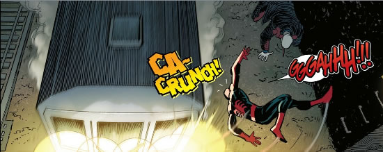On a scale of 1 (POW) to 10 (BLRKBQRKPQRBLNB), CA-CRUNCH! Rates a 3. I am confused by this sound. Is the train ‘crunching’ on the impact or is Spider-Man? My assumption is Spider-Man, but what would indicate a breaking of something, wouldn’t it? Did Spider-Man break his hip? His back? Will we see any evidence of this next issue? Am I over analyzing a simple sound? Probably.