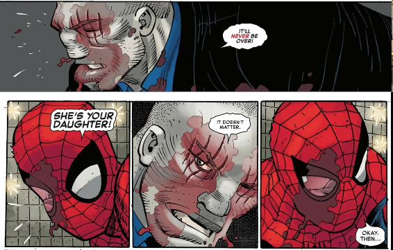 But we knew this already, so there is nothing to analyze about that. It is, though, super refreshing to see a Spider-Man act like Spider-Man. This is a battle in the same vein as the Kingpin beat down (not the same level of greatness, mind you – that issue is iconic – just of similar nature).