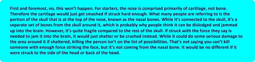 I’m reading it and thinking shouldn’t this be an immediate kill here? I remember hearing somewhere that a strike to the nose like this can shove it into the brain and kill a person. So I did what I love to do most – researched it! (And this is why these reviews take so long to write!)