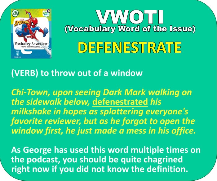 1) “‘Defenestrate’ is one of my favorite words!” It’s also the reason I’ll always remember that “fenetre” is French for “window.” A perfect cinematic example is Peter Parker committing defenestration (more or less) upon the killer of Uncle Ben (who turned out to be the getaway driver) in Sam Raimi’s Spider-man. Speaking of which…