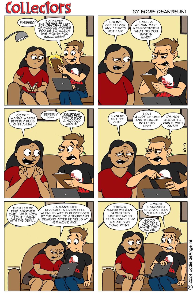 Eddie deAngelini is a long time comic book fan and collector. He is the writer and artist of the internet comic strip Collectors, which is loosely based on his own life, marriage and comic collecting obsession. His love of comics began at a young age and his claim to fame is owning every issue of Amazing Spider-Man. He currently lives in Los Angeles with his wife Kristen, where they plan together for the inevitable zombie apocalypse.