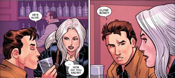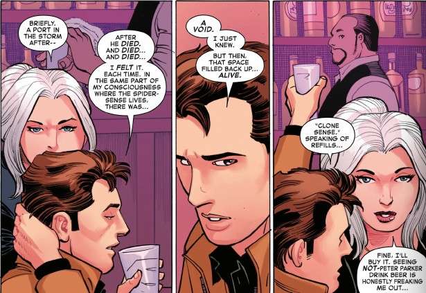At Da Grand Tavern, Ben Reilly (posing as Peter) meets with Felicia. He explains that he knows Peter is alive through their “clone bond”. He explains that when Peter died repeatedly during the 8 Deaths of Spider-Man story, he felt a void in his head when Peter was dead, but it disappeared each time Peter came back to life.
