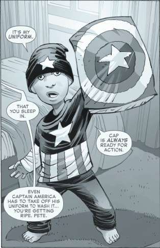 We have another flashback of young Peter (because it’s an ASM issue written by Joe Kelly) of him going to preschool in his Captain America pajamas, much to Uncle Ben and Aunt May’s chagrin.