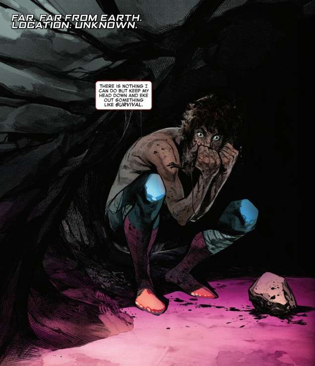 Far, far from the Earth, on an unknown planet, a disheveled Peter Parker is living in a cave, killing small animals and eating them raw.