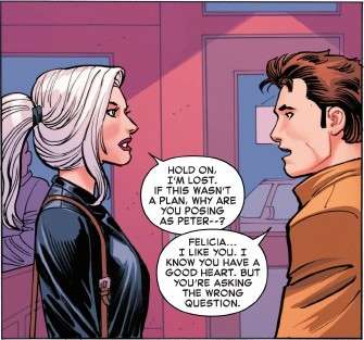 Let’s talk about Ben here. He realizes Peter is missing, so his plan is to take over his life? Based on his last appearance we would expect this to be because he hates Peter and wants his life. But his conversation with Felicia makes it sound like he’s doing this for good reasons – to keep Peter’s life stable while he’s away. But that makes no sense based on Ben’s last appearance. This would make much more sense if the last time we saw Ben was when he ended up helping Spider-Man against Queen Goblin after being healed with TWD. The Ben at the end of that issue seemed to come to terms with his and Peter’s relationship, and seemed to no longer want to be a villain. But at the end of the Zells run we had Ben return to his psychotic “I blame Peter for everything and must steal his life” phase. So for him to be doing this now makes no sense.