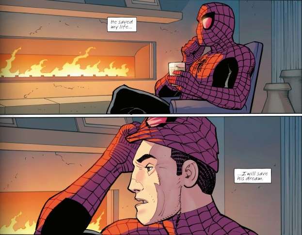 “Spider-Man” arrives home, pours himself a drink, sits by the fire, and unmasks, revealing himself to be … Norman Osborn!