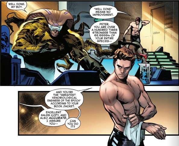 Weeks later, Peter is living on The Beacon, a deep-space research vessel with Dr. Xanto Starblood, an alien scientist who wears a flexisuit (similar in appearance to a symbiote) for his work. He rescued Peter from the planet, and while he is unable to return him to Earth due to the current war in the galaxy (I don’t read Imperial), they live a comfortable life on this vessel, doing science together.