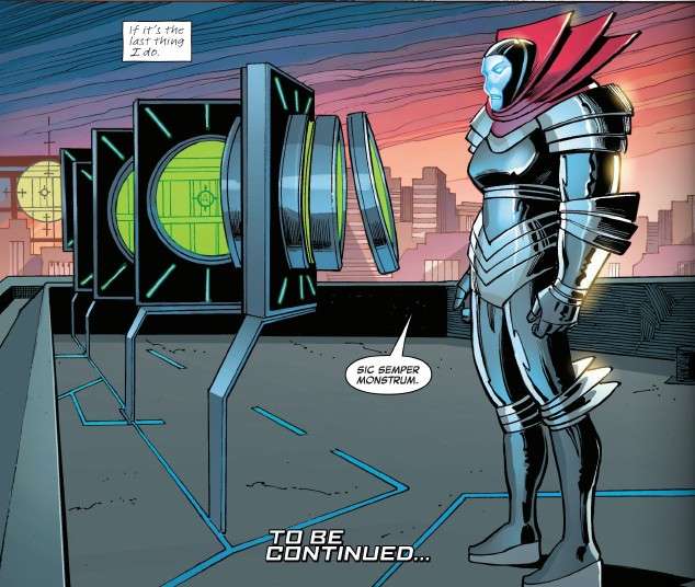 Outside Norman’s apartment, an armored figure is watching him, saying “death to monsters” in Latin.