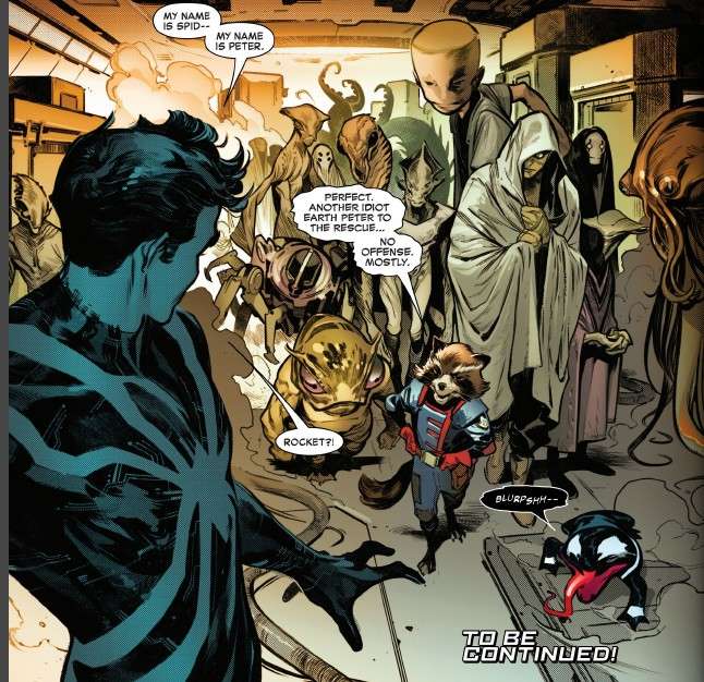 We find out who “Peter Parker” really is. Felicia does some investigating and chatting. We find out who “Spider-Man” really is. Meanwhile, in outer space(1), (the real) Peter is chilling out with an alien scientist, frees a bunch of aliens, including Rocket Raccoon. All this, plus, did somebody say “backups”???(2)