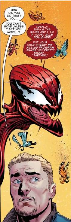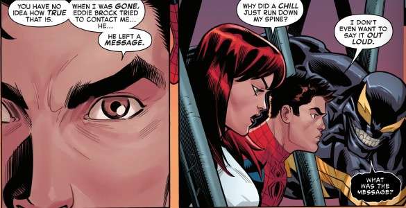 Peter and MJ talk about recent events – him being punched into outer space, and her ending up bonded to the Venom symbiote. He tells her – and the symbiote – that Eddie told him that Carnage knows his secret identity, and that all of his loved ones are in danger.